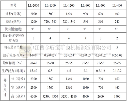 1.螺旋溜槽设备参数表: