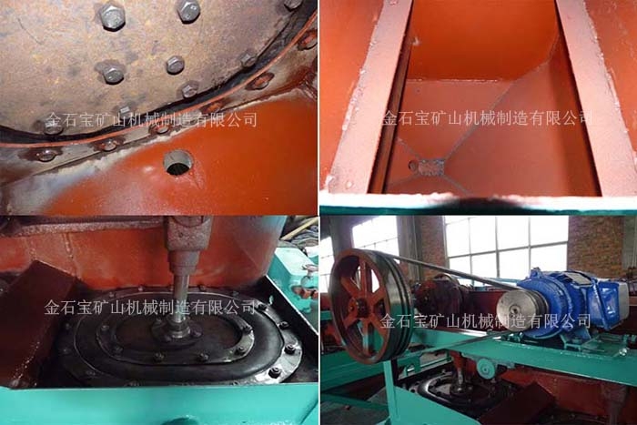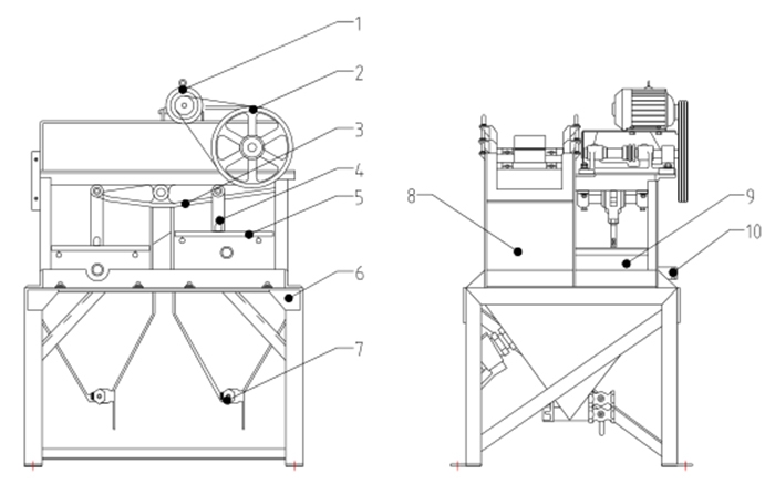 1、电动机 2、传动部分 3、摇臂 4、连杆 5、橡胶隔膜 6、机架 7、排矿口 8、跳汰室 9、隔膜室 10、补水口