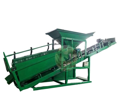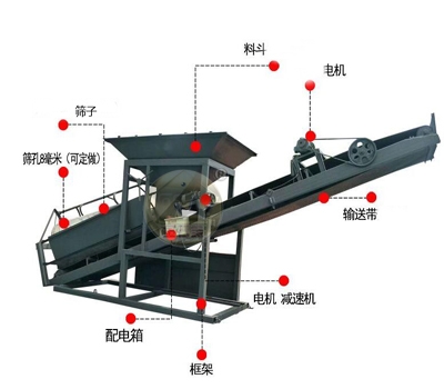 滚筒筛沙机主要由滚筒、机架、料斗、减速器、电动机、输送带等组成。它是仿照人工利用斜面筛网筛砂的工作原理,石料经料斗进入滚筒后,一方面随着滚筒转动而被筛选,一方面粒度大的石料沿着滚筒的斜度向前流动,通过不同网目的的筛网逐渐被筛出。