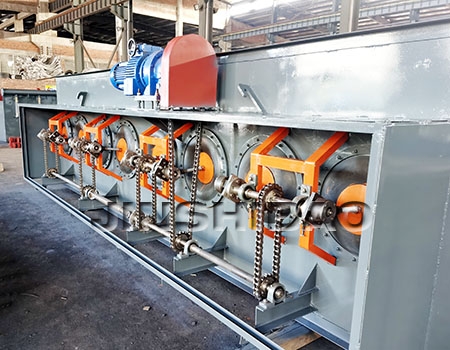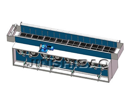 电机通过链条带动底部传动轴旋转,传动轴通过链条带动传动装置运动,传动装置推动鼓膜做往复运动,洗砂室里的物料在往复