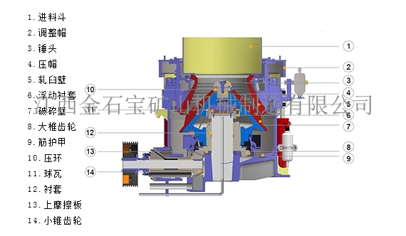 圆锥破碎机结构简介:圆锥破碎机其结构主要有机架、水平轴、动锥体、平衡轮、偏心套、上破碎壁(固定锥)、下破碎壁(动锥)、液力偶合器、润滑系统、液压系统。